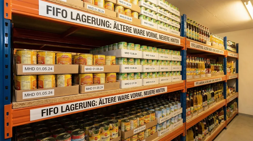 Ein klassisches Prinzip aus der Logistik. Immer zuerst die ältesten Produkte verkaufen oder nutzen. So verhinderst du, dass Ware abläuft oder ungenutzt entsorgt werden muss.